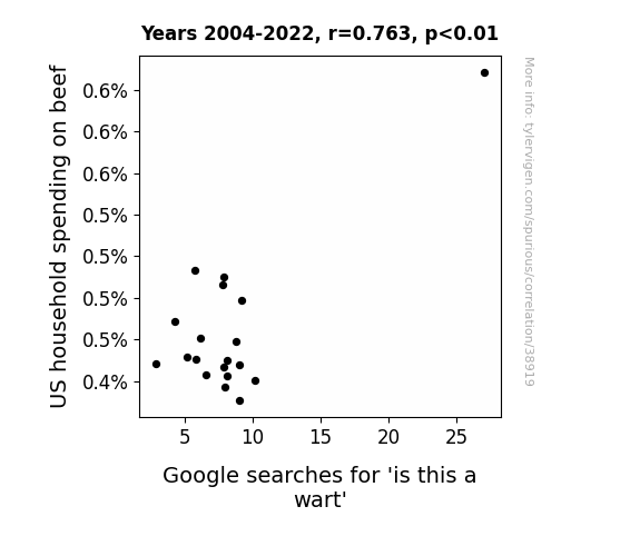 This means 58.2% of the change in the one variable (i.e., Google searches for 'is this a wart') is predictable based on the change in the other (i.e., US household spending on beef) over the 19 years from 2004 through 2022.