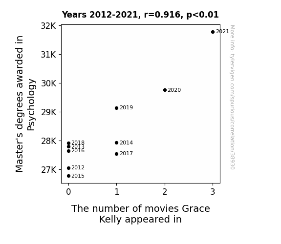 This means 83.8% of the change in the one variable (i.e., The number of movies Grace Kelly appeared in) is predictable based on the change in the other (i.e., Master's degrees awarded in Psychology) over the 10 years from 2012 through 2021.