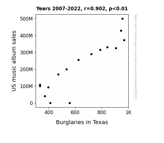 This means 81.4% of the change in the one variable (i.e., Burglaries in Texas) is predictable based on the change in the other (i.e., US music album sales) over the 16 years from 2007 through 2022.