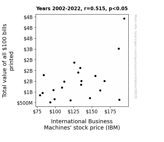 This means 26.5% of the change in the one variable (i.e., International Business Machines' stock price (IBM)) is predictable based on the change in the other (i.e., Total value of all $100 bills printed) over the 21 years from 2002 through 2022.