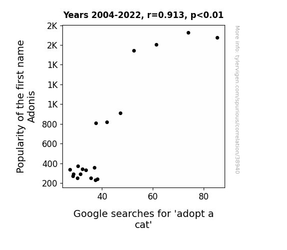 This means 83.3% of the change in the one variable (i.e., Google searches for 'adopt a cat') is predictable based on the change in the other (i.e., Popularity of the first name Adonis) over the 19 years from 2004 through 2022.