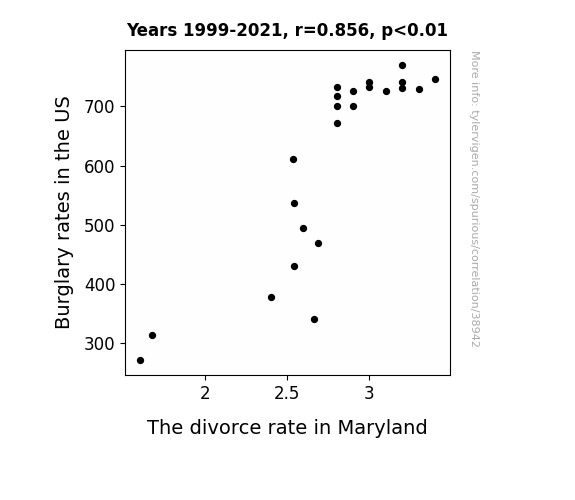 This means 73.3% of the change in the one variable (i.e., The divorce rate in Maryland) is predictable based on the change in the other (i.e., Burglary rates in the US) over the 23 years from 1999 through 2021.