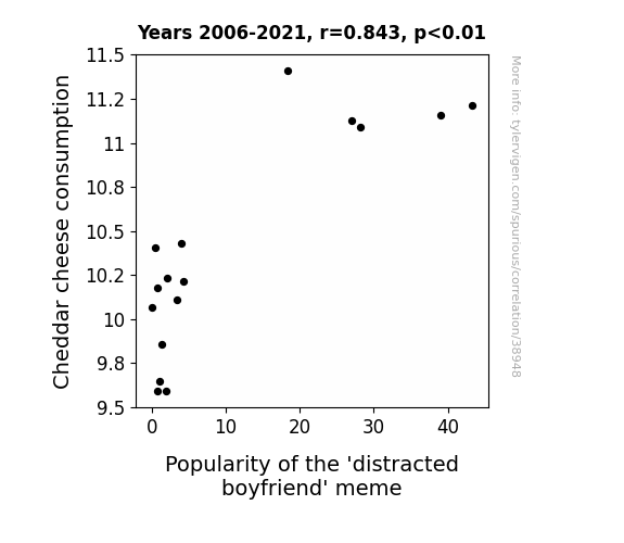 This means 71% of the change in the one variable (i.e., Popularity of the 'distracted boyfriend' meme) is predictable based on the change in the other (i.e., Cheddar cheese consumption) over the 16 years from 2006 through 2021.