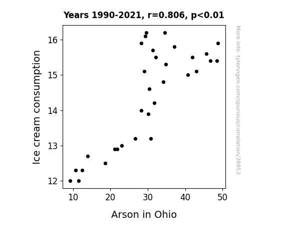 This means 64.9% of the change in the one variable (i.e., Arson in Ohio) is predictable based on the change in the other (i.e., Ice cream consumption) over the 32 years from 1990 through 2021.