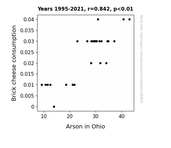 This means 70.9% of the change in the one variable (i.e., Arson in Ohio) is predictable based on the change in the other (i.e., Brick cheese consumption) over the 27 years from 1995 through 2021.