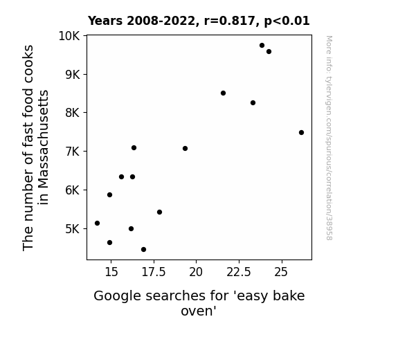 This means 66.7% of the change in the one variable (i.e., Google searches for 'easy bake oven') is predictable based on the change in the other (i.e., The number of fast food cooks in Massachusetts) over the 15 years from 2008 through 2022.