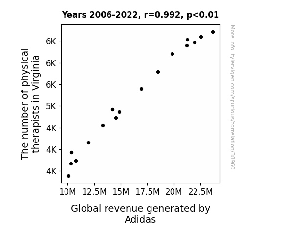 This means 98.5% of the change in the one variable (i.e., Global revenue generated by Adidas) is predictable based on the change in the other (i.e., The number of physical therapists in Virginia) over the 17 years from 2006 through 2022.