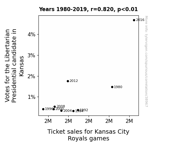This means 67.2% of the change in the one variable (i.e., Ticket sales for Kansas City Royals games) is predictable based on the change in the other (i.e., Votes for the Libertarian Presidential candidate in Kansas) over the 9 years from 1980 through 2019.