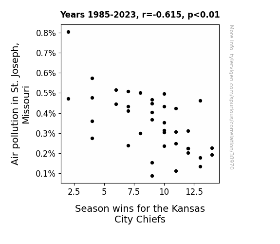 This means 37.8% of the change in the one variable (i.e., Season wins for the Kansas City Chiefs) is predictable based on the change in the other (i.e., Air pollution in St. Joseph, Missouri) over the 39 years from 1985 through 2023.