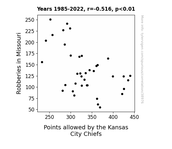This means 26.6% of the change in the one variable (i.e., Points allowed by the Kansas City Chiefs) is predictable based on the change in the other (i.e., Robberies in Missouri) over the 38 years from 1985 through 2022.