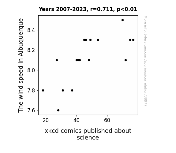 This means 50.5% of the change in the one variable (i.e., xkcd comics published about science) is predictable based on the change in the other (i.e., The wind speed in Albuquerque) over the 17 years from 2007 through 2023.