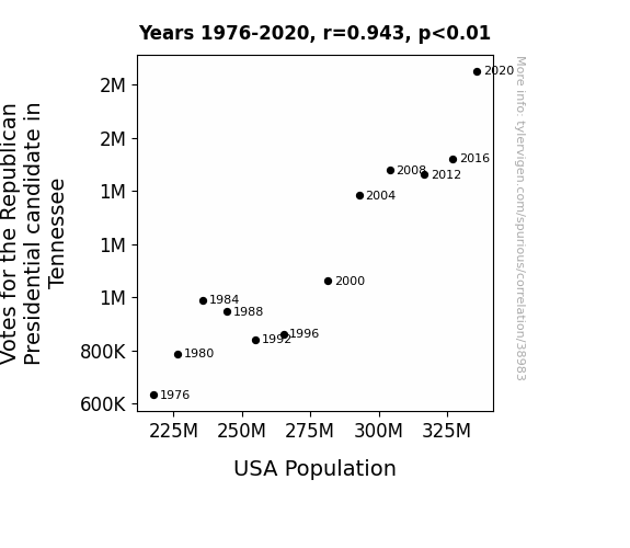 This means 88.9% of the change in the one variable (i.e., USA Population) is predictable based on the change in the other (i.e., Votes for the Republican Presidential candidate in Tennessee) over the 12 years from 1976 through 2020.