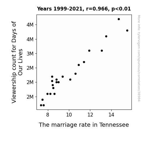 This means 93.3% of the change in the one variable (i.e., The marriage rate in Tennessee) is predictable based on the change in the other (i.e., Viewership count for Days of Our Lives) over the 23 years from 1999 through 2021.