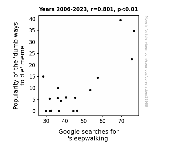 This means 64.1% of the change in the one variable (i.e., Google searches for 'sleepwalking') is predictable based on the change in the other (i.e., Popularity of the 'dumb ways to die' meme) over the 18 years from 2006 through 2023.