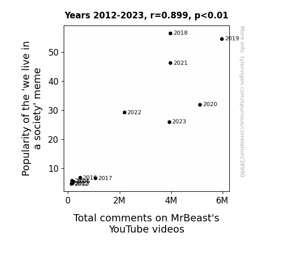 This means 80.8% of the change in the one variable (i.e., Total comments on MrBeast's YouTube videos) is predictable based on the change in the other (i.e., Popularity of the 'we live in a society' meme) over the 12 years from 2012 through 2023.