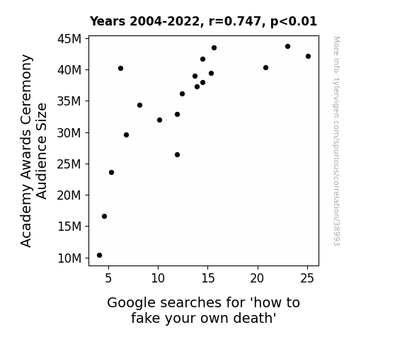 This means 55.7% of the change in the one variable (i.e., Google searches for 'how to fake your own death') is predictable based on the change in the other (i.e., Academy Awards Ceremony Audience Size) over the 19 years from 2004 through 2022.