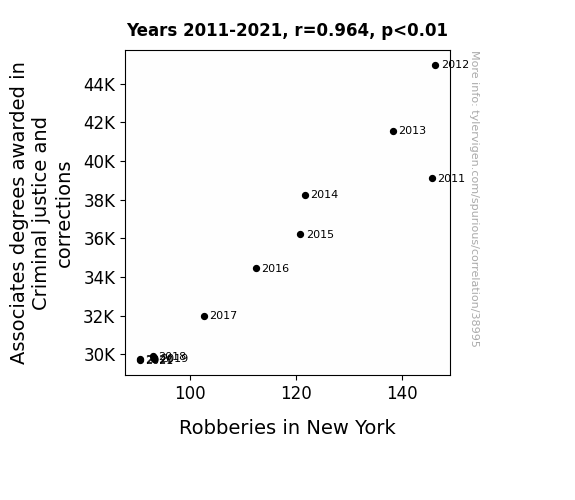 This means 93% of the change in the one variable (i.e., Robberies in New York) is predictable based on the change in the other (i.e., Associates degrees awarded in Criminal justice and corrections) over the 11 years from 2011 through 2021.