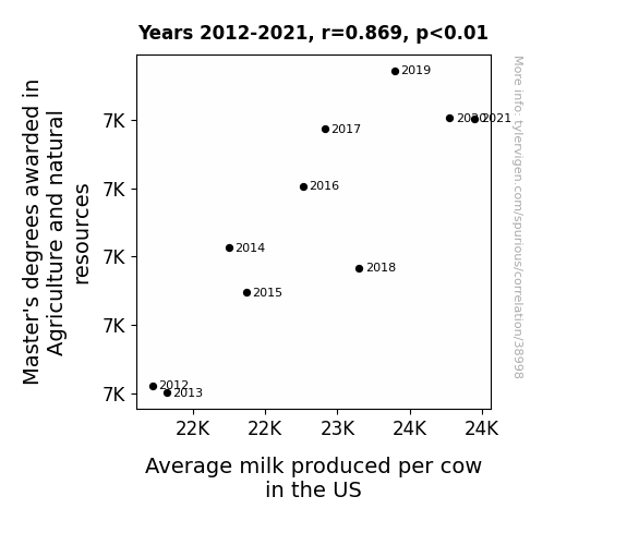 This means 75.4% of the change in the one variable (i.e., Average milk produced per cow in the US) is predictable based on the change in the other (i.e., Master's degrees awarded in Agriculture and natural resources) over the 10 years from 2012 through 2021.