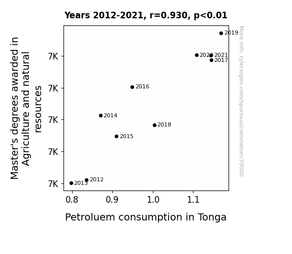 This means 86.5% of the change in the one variable (i.e., Petroluem consumption in Tonga) is predictable based on the change in the other (i.e., Master's degrees awarded in Agriculture and natural resources) over the 10 years from 2012 through 2021.