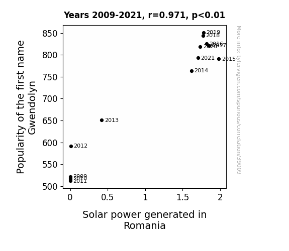 This means 94.3% of the change in the one variable (i.e., Solar power generated in Romania) is predictable based on the change in the other (i.e., Popularity of the first name Gwendolyn) over the 13 years from 2009 through 2021.