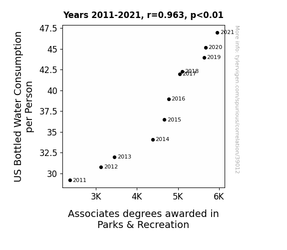 This means 92.7% of the change in the one variable (i.e., Associates degrees awarded in Parks & Recreation) is predictable based on the change in the other (i.e., US Bottled Water Consumption per Person) over the 11 years from 2011 through 2021.