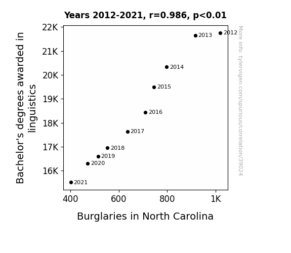 This means 97.3% of the change in the one variable (i.e., Burglaries in North Carolina) is predictable based on the change in the other (i.e., Bachelor's degrees awarded in linguistics) over the 10 years from 2012 through 2021.