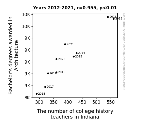 This means 91.3% of the change in the one variable (i.e., The number of college history teachers in Indiana) is predictable based on the change in the other (i.e., Bachelor's degrees awarded in Architecture) over the 10 years from 2012 through 2021.