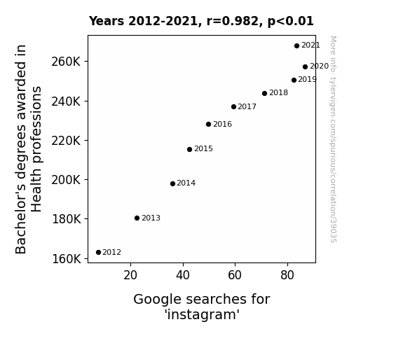 This means 96.4% of the change in the one variable (i.e., Google searches for 'instagram') is predictable based on the change in the other (i.e., Bachelor's degrees awarded in Health professions) over the 10 years from 2012 through 2021.