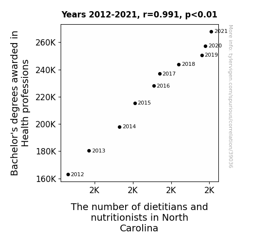 This means 98.3% of the change in the one variable (i.e., The number of dietitians and nutritionists in North Carolina) is predictable based on the change in the other (i.e., Bachelor's degrees awarded in Health professions) over the 10 years from 2012 through 2021.