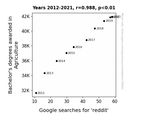 This means 97.6% of the change in the one variable (i.e., Google searches for 'reddit') is predictable based on the change in the other (i.e., Bachelor's degrees awarded in Agriculture) over the 10 years from 2012 through 2021.