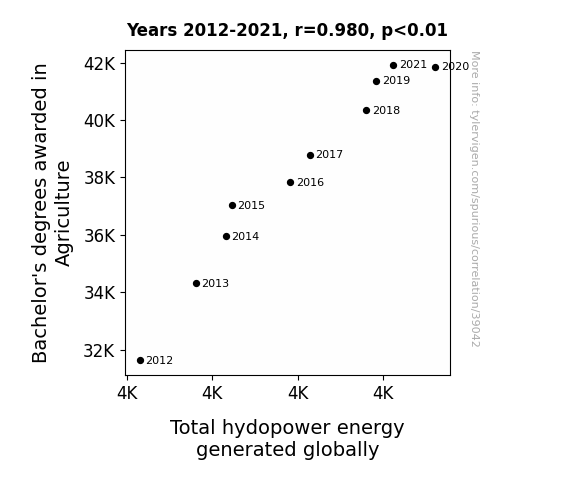 This means 96% of the change in the one variable (i.e., Total hydopower energy generated globally) is predictable based on the change in the other (i.e., Bachelor's degrees awarded in Agriculture) over the 10 years from 2012 through 2021.