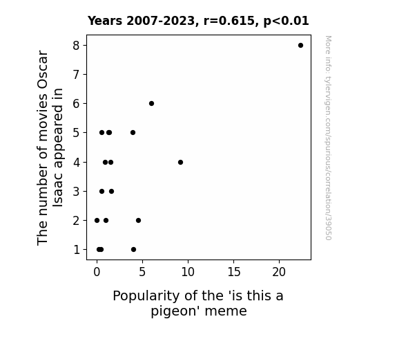 This means 37.9% of the change in the one variable (i.e., Popularity of the 'is this a pigeon' meme) is predictable based on the change in the other (i.e., The number of movies Oscar Isaac appeared in) over the 17 years from 2007 through 2023.