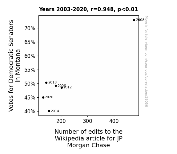 This means 89.9% of the change in the one variable (i.e., Number of edits to the Wikipedia article for JP Morgan Chase) is predictable based on the change in the other (i.e., Votes for Democratic Senators in Montana) over the 6 years from 2003 through 2020.