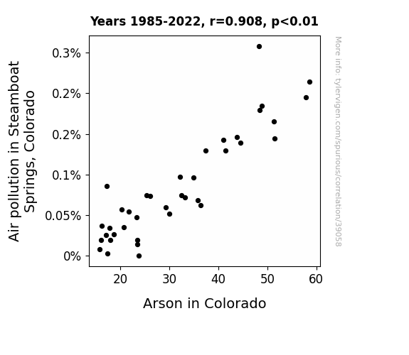 This means 82.5% of the change in the one variable (i.e., Arson in Colorado) is predictable based on the change in the other (i.e., Air pollution in Steamboat Springs, Colorado) over the 38 years from 1985 through 2022.