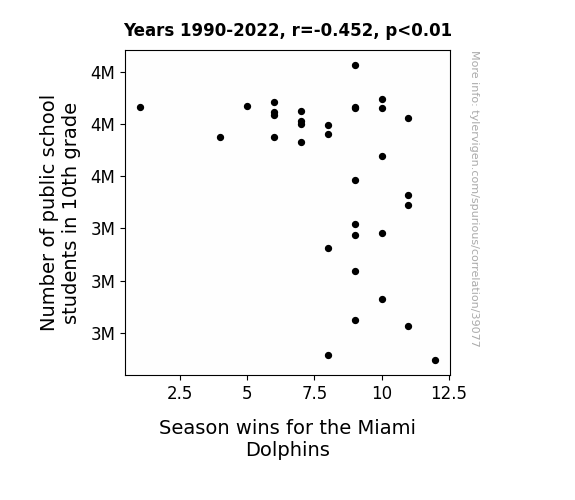 This means 20.5% of the change in the one variable (i.e., Season wins for the Miami Dolphins) is predictable based on the change in the other (i.e., Number of public school students in 10th grade) over the 33 years from 1990 through 2022.
