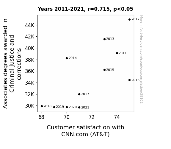This means 51.2% of the change in the one variable (i.e., Customer satisfaction with CNN.com (AT&T)) is predictable based on the change in the other (i.e., Associates degrees awarded in Criminal justice and corrections) over the 11 years from 2011 through 2021.