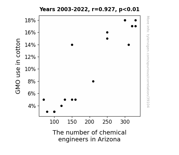 This means 86% of the change in the one variable (i.e., The number of chemical engineers in Arizona) is predictable based on the change in the other (i.e., GMO use in cotton) over the 20 years from 2003 through 2022.