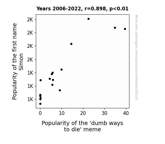 This means 80.6% of the change in the one variable (i.e., Popularity of the 'dumb ways to die' meme) is predictable based on the change in the other (i.e., Popularity of the first name Simon) over the 17 years from 2006 through 2022.
