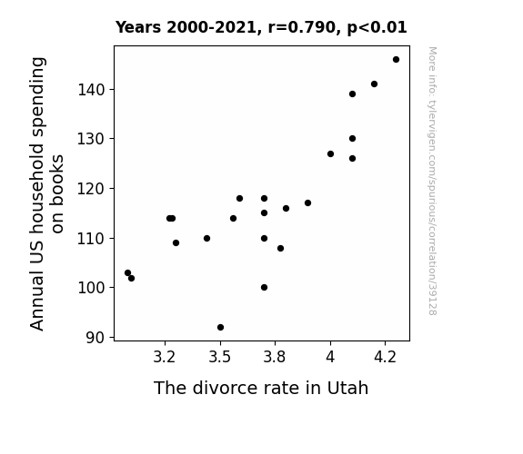 This means 62.3% of the change in the one variable (i.e., The divorce rate in Utah) is predictable based on the change in the other (i.e., Annual US household spending on books) over the 22 years from 2000 through 2021.