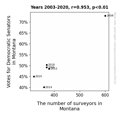 This means 90.8% of the change in the one variable (i.e., The number of surveyors in Montana) is predictable based on the change in the other (i.e., Votes for Democratic Senators in Montana) over the 6 years from 2003 through 2020.