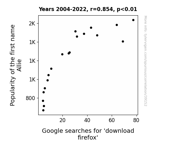 This means 72.9% of the change in the one variable (i.e., Google searches for 'download firefox') is predictable based on the change in the other (i.e., Popularity of the first name Allie) over the 19 years from 2004 through 2022.