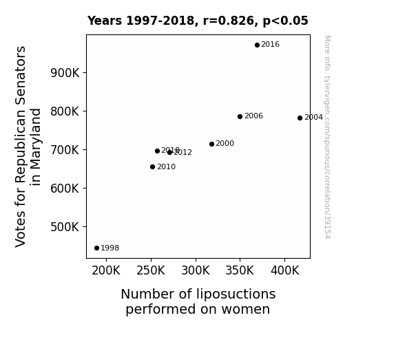 This means 68.2% of the change in the one variable (i.e., Number of liposuctions performed on women) is predictable based on the change in the other (i.e., Votes for Republican Senators in Maryland) over the 8 years from 1997 through 2018.