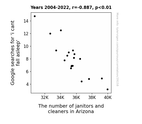 This means 78.6% of the change in the one variable (i.e., The number of janitors and cleaners in Arizona) is predictable based on the change in the other (i.e., Google searches for 'i cant fall asleep') over the 19 years from 2004 through 2022.
