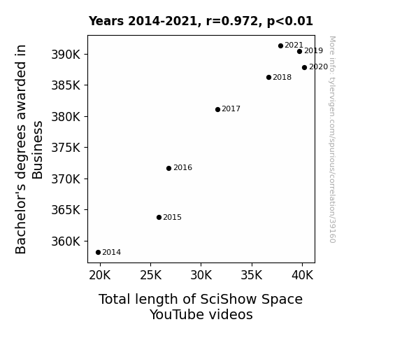 This means 94.5% of the change in the one variable (i.e., Total length of SciShow Space YouTube videos) is predictable based on the change in the other (i.e., Bachelor's degrees awarded in Business) over the 8 years from 2014 through 2021.