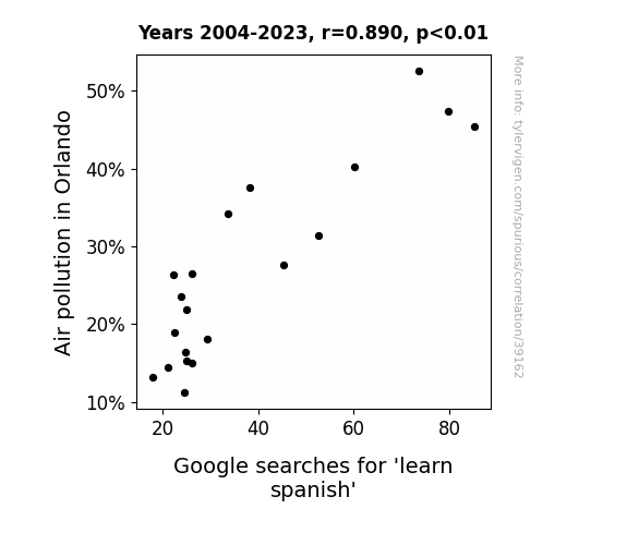 This means 79.2% of the change in the one variable (i.e., Google searches for 'learn spanish') is predictable based on the change in the other (i.e., Air pollution in Orlando) over the 20 years from 2004 through 2023.