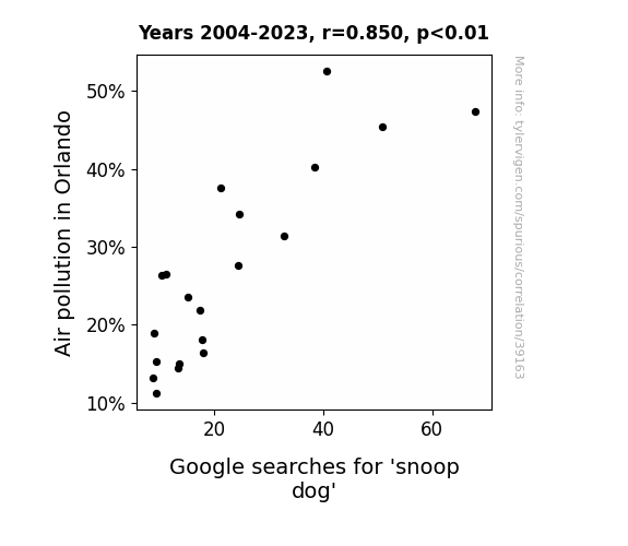 This means 72.3% of the change in the one variable (i.e., Google searches for 'snoop dog') is predictable based on the change in the other (i.e., Air pollution in Orlando) over the 20 years from 2004 through 2023.