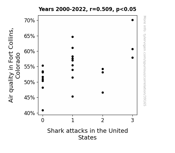 This means 25.9% of the change in the one variable (i.e., Shark attacks in the United States) is predictable based on the change in the other (i.e., Air quality in Fort Collins, Colorado) over the 23 years from 2000 through 2022.