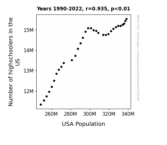 This means 87.3% of the change in the one variable (i.e., USA Population) is predictable based on the change in the other (i.e., Number of highschoolers in the US) over the 33 years from 1990 through 2022.