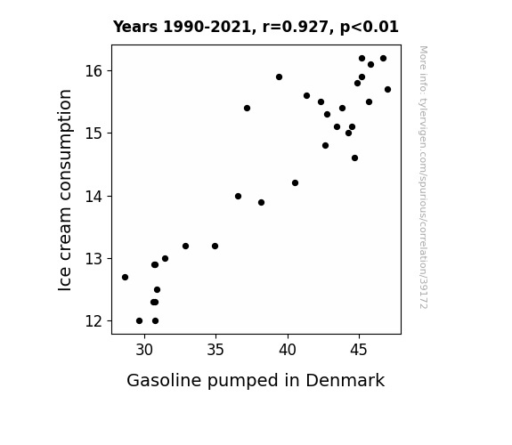 This means 86% of the change in the one variable (i.e., Gasoline pumped in Denmark) is predictable based on the change in the other (i.e., Ice cream consumption) over the 32 years from 1990 through 2021.