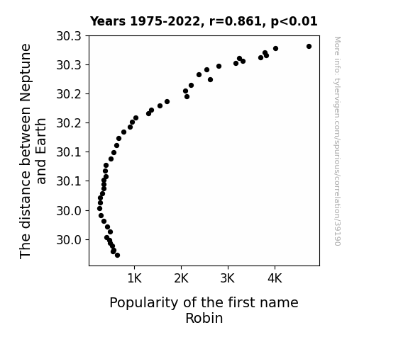 This means 74.2% of the change in the one variable (i.e., Popularity of the first name Robin) is predictable based on the change in the other (i.e., The distance between Neptune and Earth) over the 48 years from 1975 through 2022.